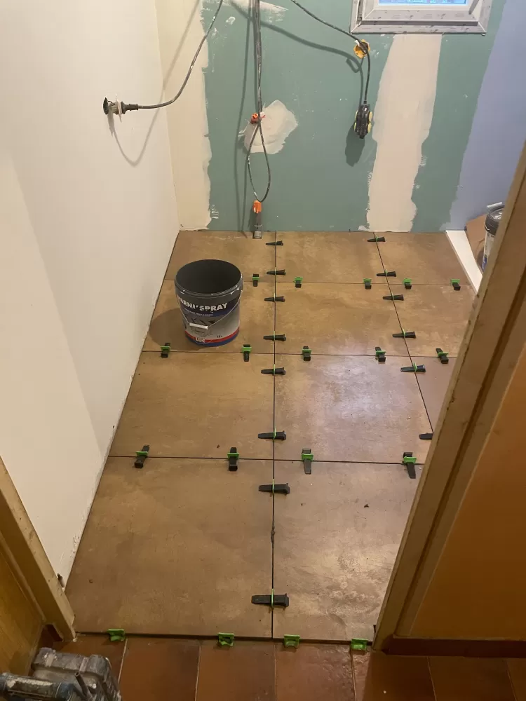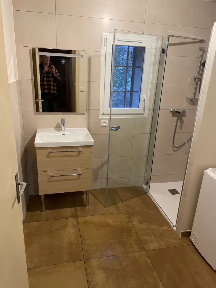 Il est ensuite venu remplacer la baignoire par une douche et a installé un meuble vasque. Il a ensuite réalisé le doublage des murs en plaque de plâtre hydrofuge puis le ratissage des murs et plafonds et a également posé le carrelage au sol ainsi que la faïence sur les murs.